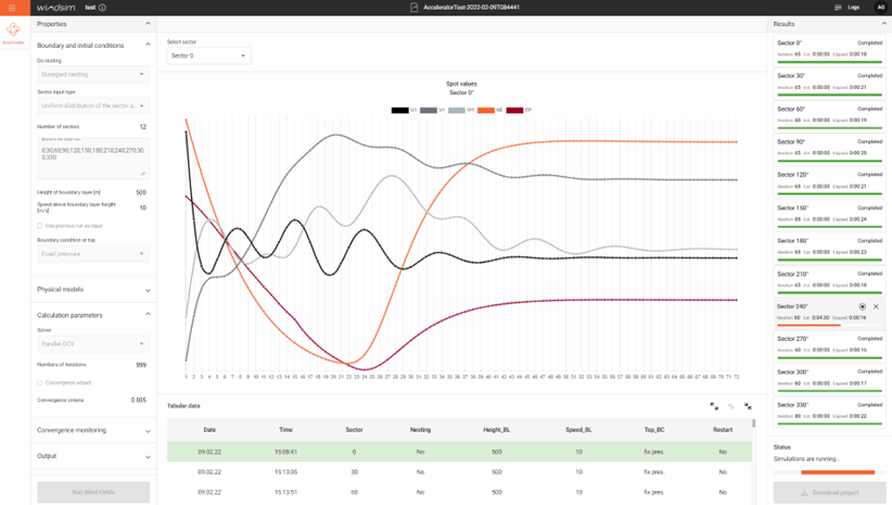 The wind field simulations are submitted to the cloud, and simulations for each sector run independently on separate servers.