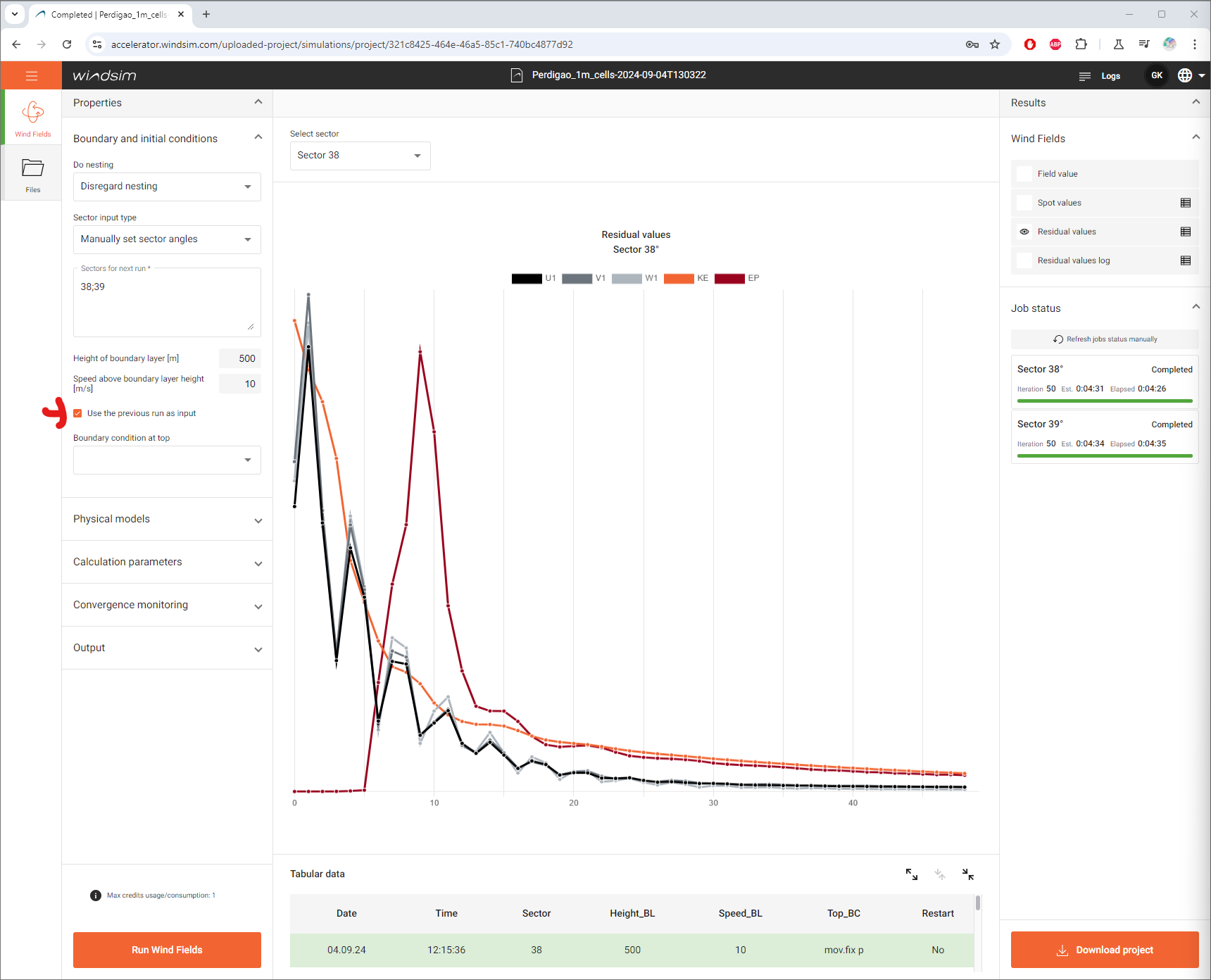 Previously you had ran sectors: [0;60;120;160;360] to 500 iterations. After looking at the project afterward you note that sector 60 and 120 where the interesting wind directions and you want to see how they resolve.